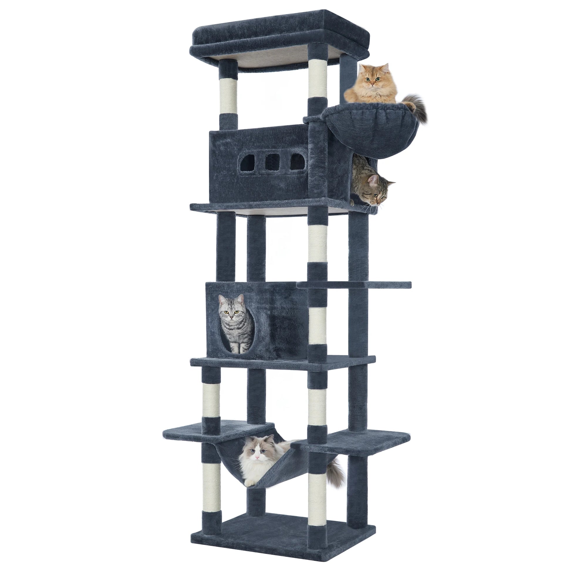 Sa grande plateforme rembourrée de 60 x 40 cm permet à votre chat de s’étirer confortablement, tandis que la niche spacieuse de 60 x 30 cm avec fenêtre d’aération lui offre un espace calme pour dormir en toute tranquillité. Cet arbre à chat multi-niveaux comprend également 2 niches douillettes, un hamac moelleux, un panier suspendu et plusieurs pompons, créant un véritable espace de jeu et de détente.
