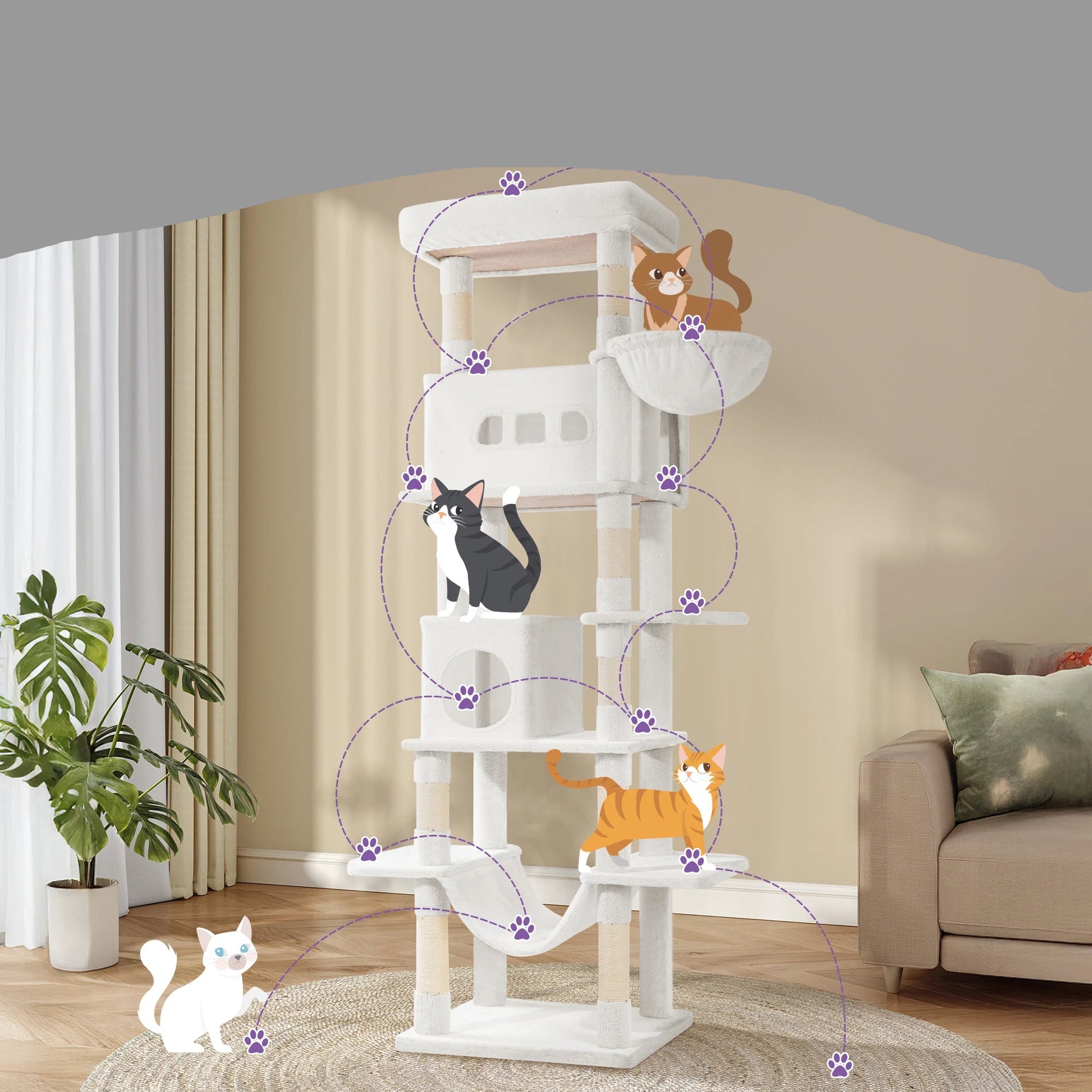 Fabriqué avec des poteaux robustes en chanvre et des zones de griffoir en sisal, il aide votre chat à entretenir ses griffes tout en protégeant vos meubles. Sa base renforcée avec système anti-basculement assure une excellente stabilité, même avec plusieurs chats.